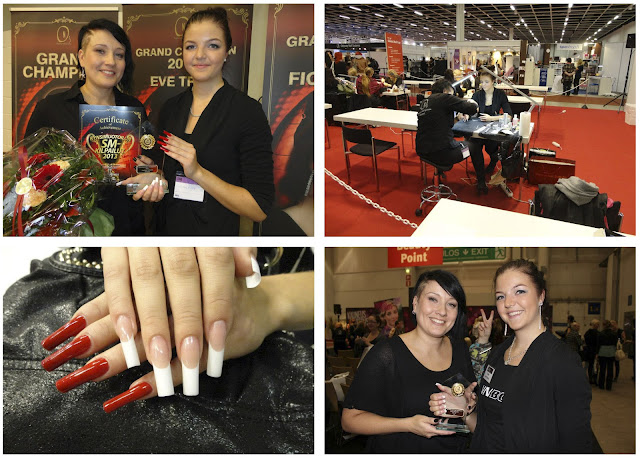 Perjantaina olin tosiaan kynsimallina omalle kynsihuoltajalleni Acrylic Frenchin SM-kilpailuissa. Kisat ei olisi voineet mennä paremmin, sillä voittohan sieltä napattiin! Sunnuntaina Salon Success-kilpailuissa hävittiin vain himpun verran ruotsalaisille ja tultiin toisiksi. Voitto tosiaan jäi ihan minimaalisuuksista kiinni, sillä tuomarit vertailivat pitkään kynsiämme, kummat loppupeleissä ovat paremmat. Mutta alla hieman messutunnelmia, nimenomaan kynsien osalta. Muita messukuvia saatan laittaa vielä myöhemmin, kunhan vaan saan niitä käsiini...